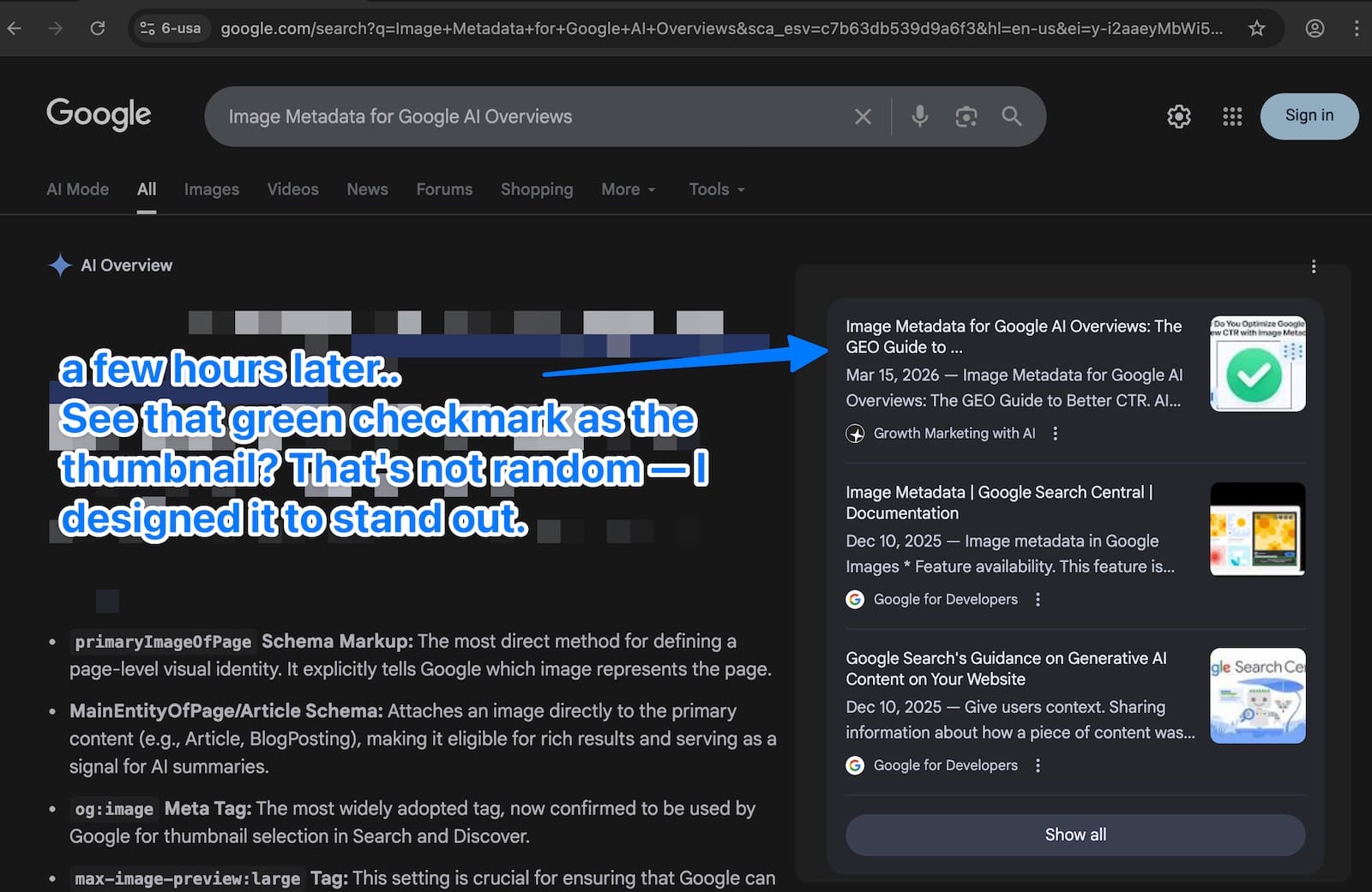So where do images fit into this? When Google cites your page in an AI Overview, it displays your site name, page title, and a thumbnail image alongside the citation link. That thumbnail is selected using the same automated logic Google uses for Search and Discover and it's now directly influenced by the metadata you provide.